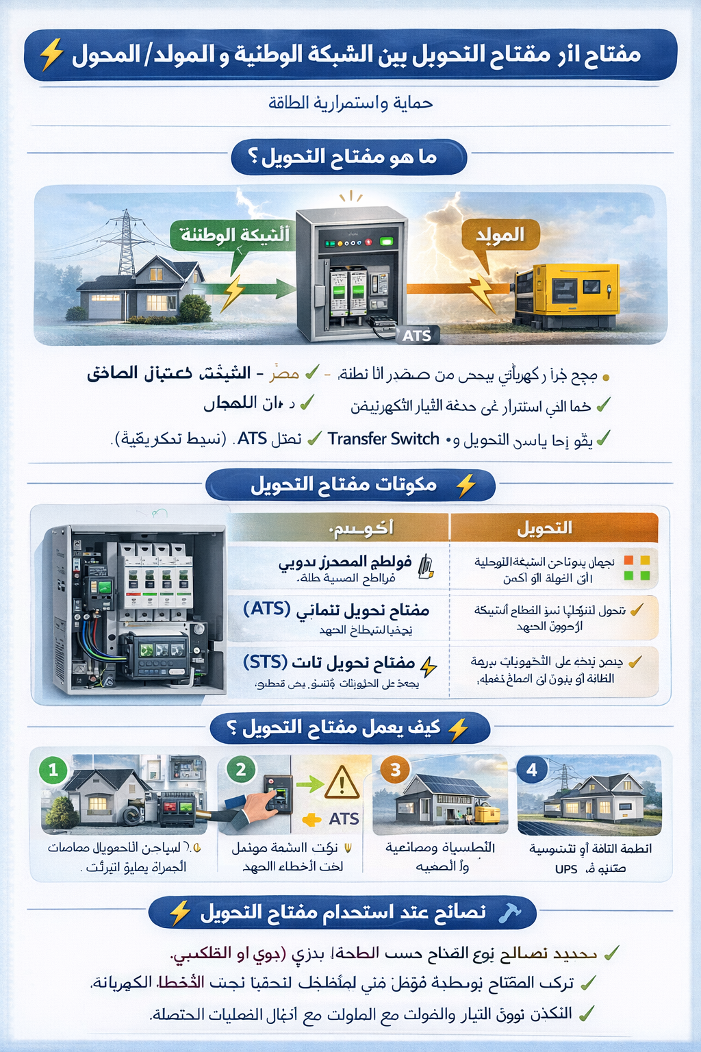 | Automatic Transfer Switch (ATS) | يتحول تلقائيًا عند انقطاع الشبكة أو عودة الجهد |